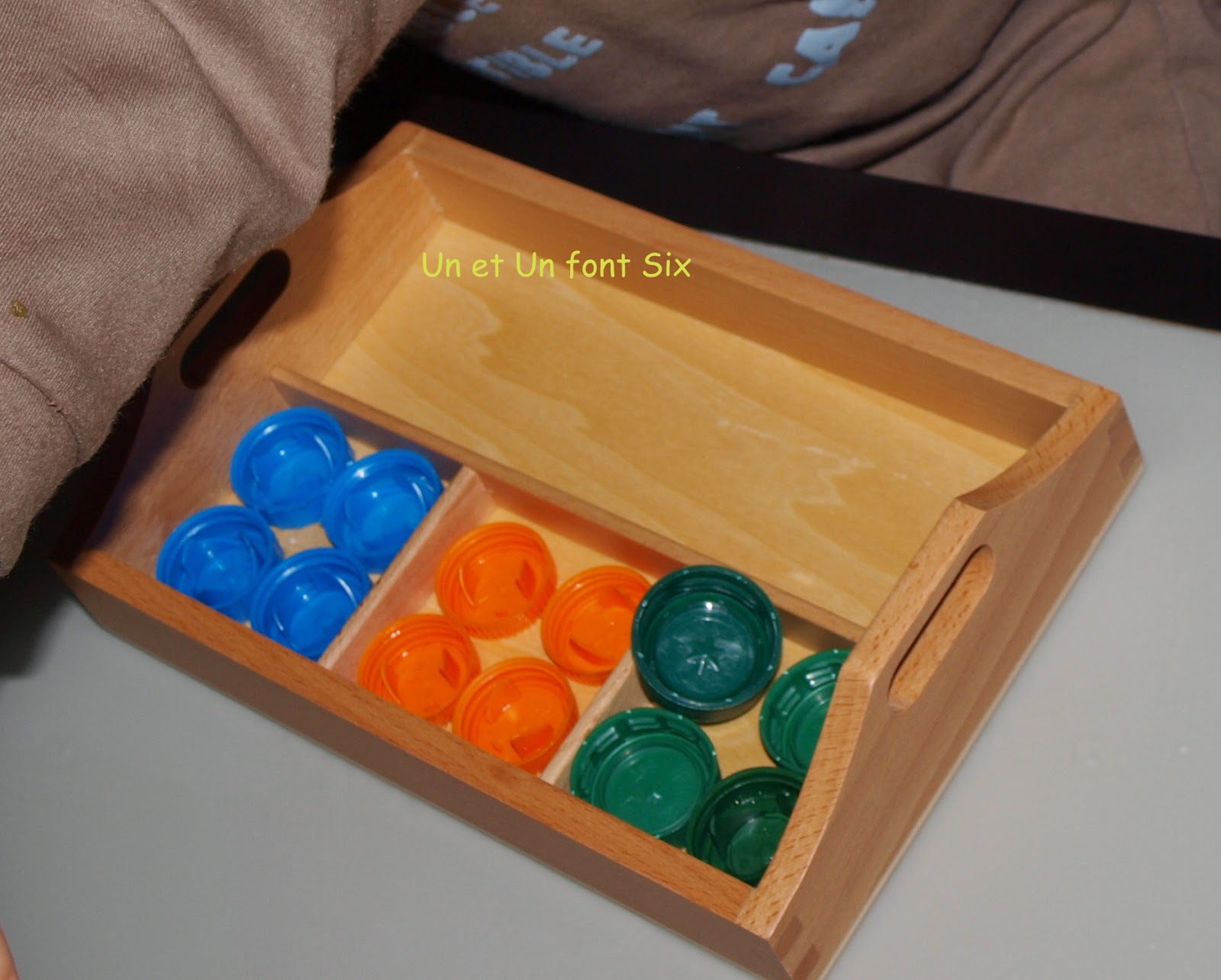 Voilà à peine reçu notre plateau de tri qu'il voulait dèja s'en servir! C'est un plateau en bois de 3 compartiments, taille adaptée aux enfants !!