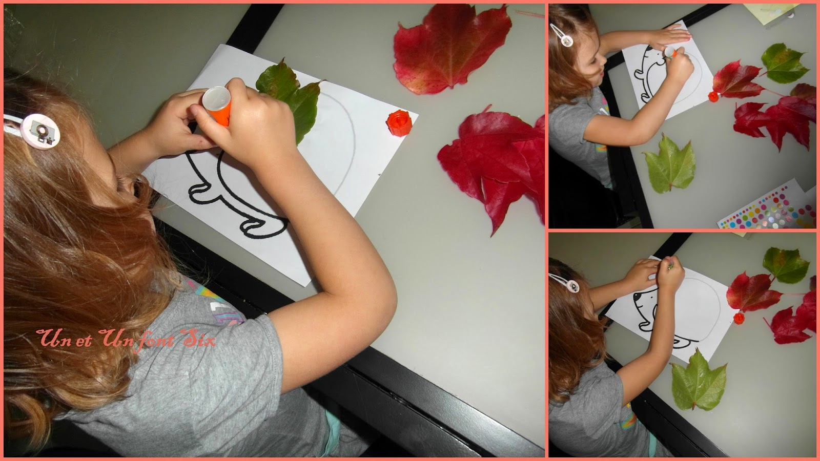 Alors S elle a décidé de le décorer des belles feuilles cueillies la veille , T lui était peu motivé donc juste quelques coups de crayons et J je lui avais mis à disposition des gommettes , des feuilles de couleurs à déchirer et coller et des crayons de couleurs .