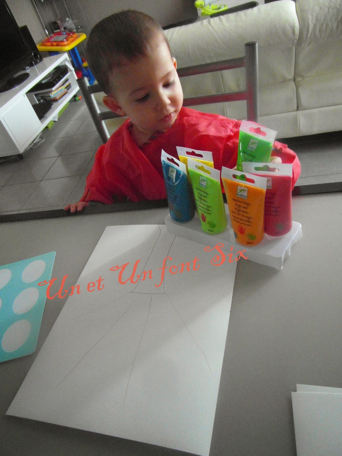 Après un premier essai laborieux en avril dernier avec J qui m’était la peinture à la bouche, nous avons fait un nouvelle essai cette aprés midi avec la peinture à doigt qu'il a eu à son anniversaire!