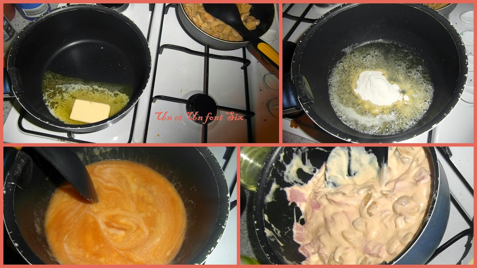 Couper le jambon en lamelles, faire revenir les champignons dans la moitié du beurre .