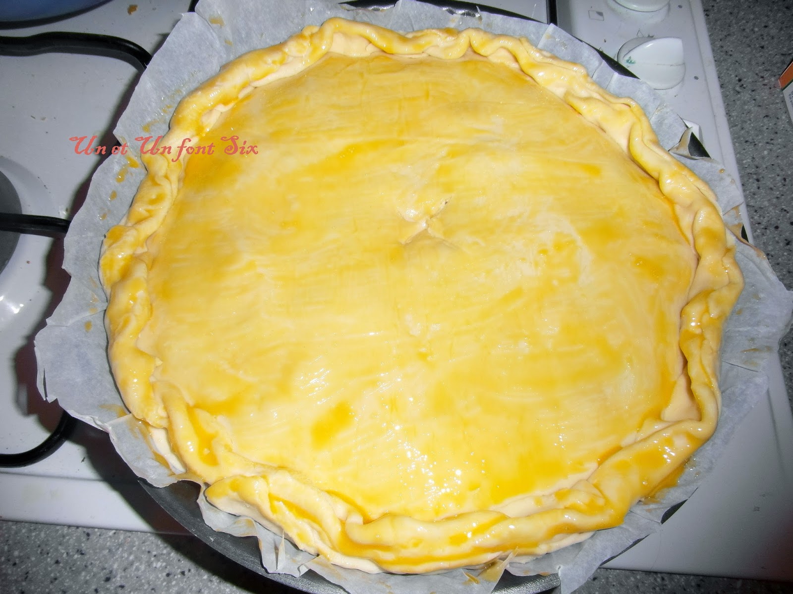 Dérouler la première pâte sur une plaque ou dans un moule à tarte ,piquer la pâte et verser la préparation. Refermer avec la seconde pâte joliment et badigeonner de jaune d’œuf.