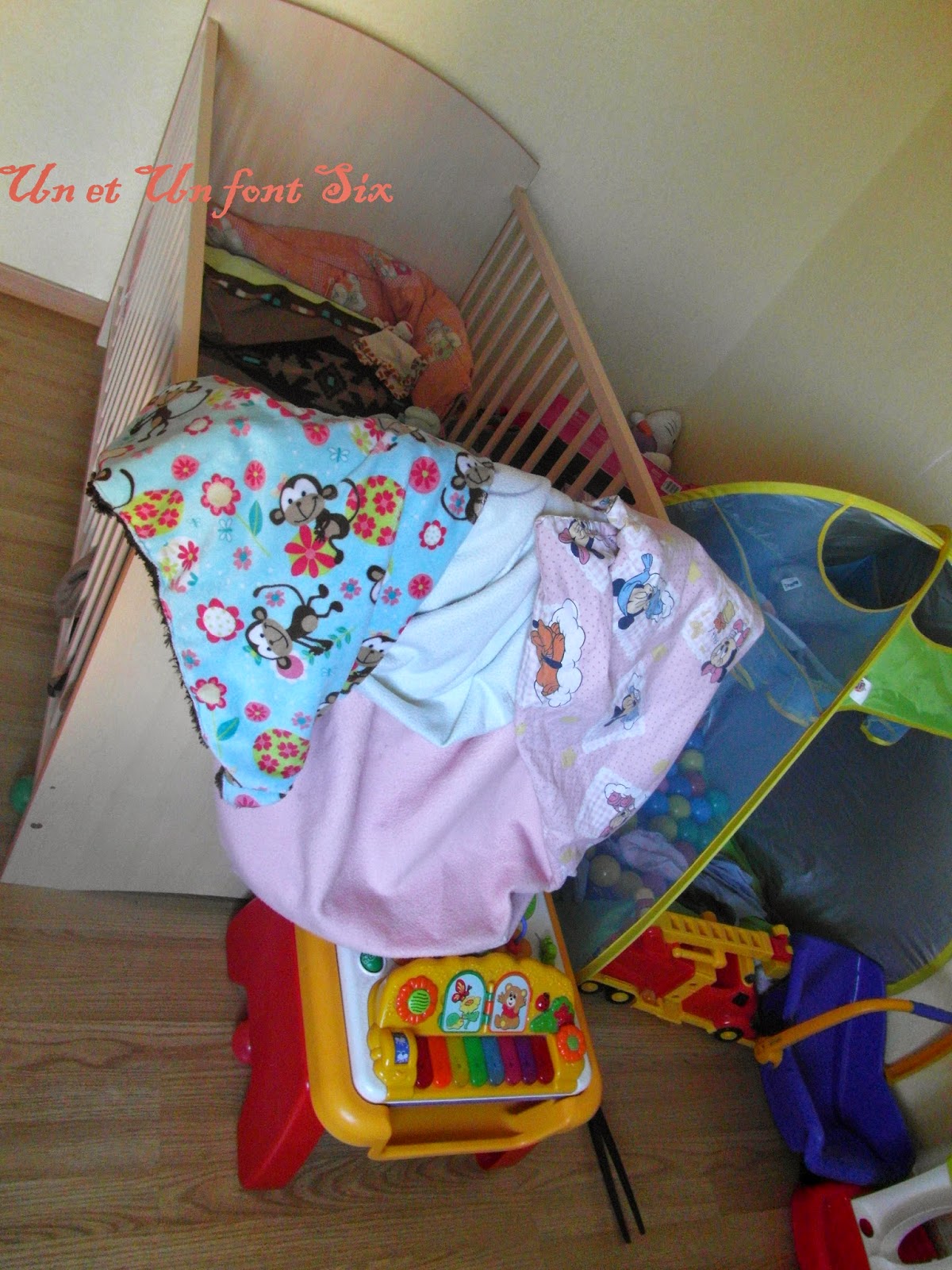 Il avait une chambre plus pour dormir ( enfin normalement) mais y jouer peu car c'était un peu sa chambre et celle de sa soeur , car il y avait encore son armoire et pas mal de joujoux donc là stop on range et on recommence .