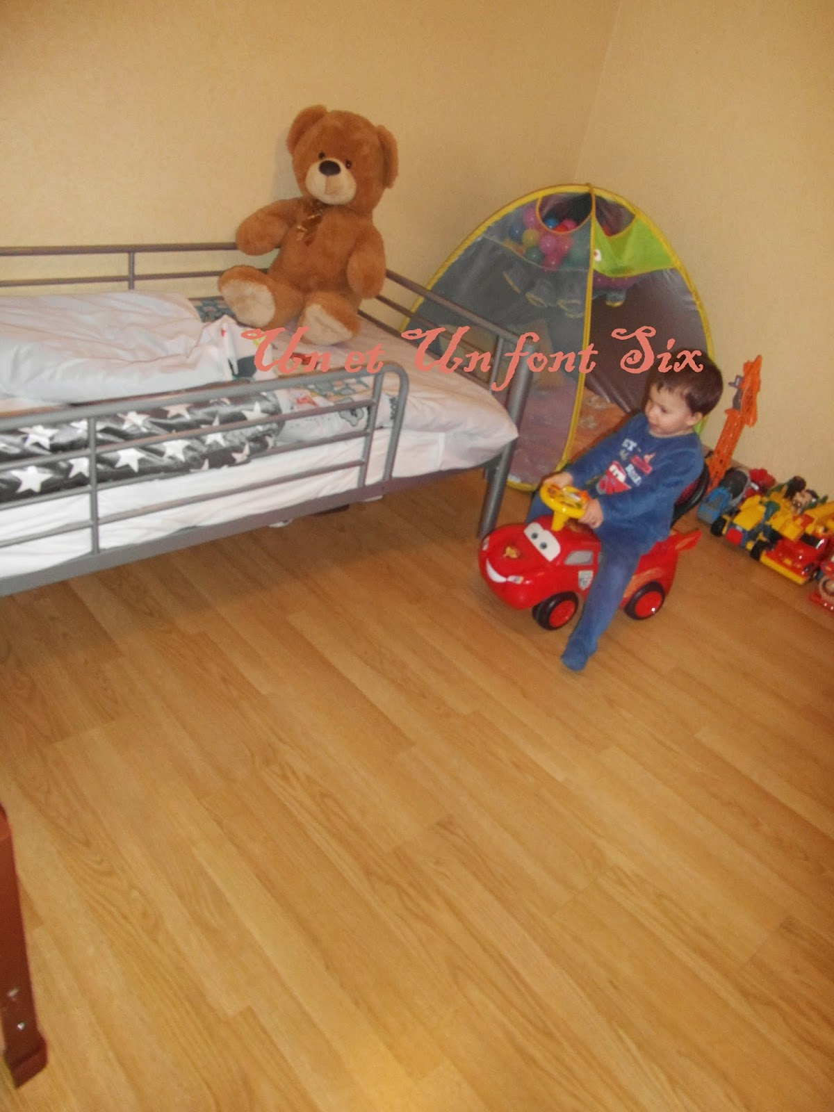 Il avait une chambre plus pour dormir ( enfin normalement) mais y jouer peu car c'était un peu sa chambre et celle de sa soeur , car il y avait encore son armoire et pas mal de joujoux donc là stop on range et on recommence .