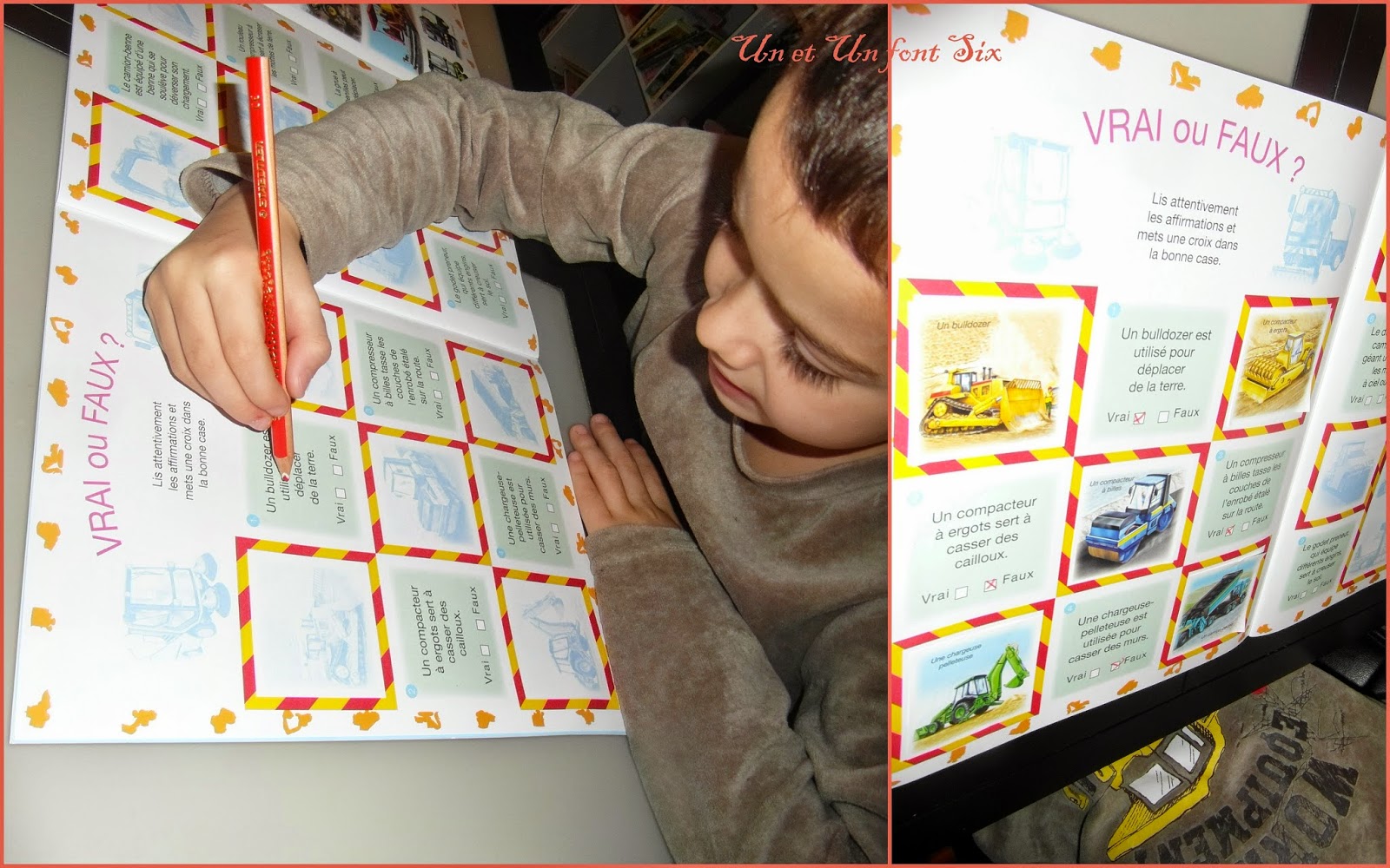 C'est un cahier d'activités pour s'amuser à dessiner des engins de chantier et à les colorier. De plus on y trouve un Vrai ou Faux , un quiz et des autocollants qui y sont rattachés ! ( Ne vous inquiétez si comme moi vous êtes nuls en engin il y a les réponses en fin de cahier) Mais pas que un jeu de recherche de erreurs qui stimule le sens d'observation des enfants.