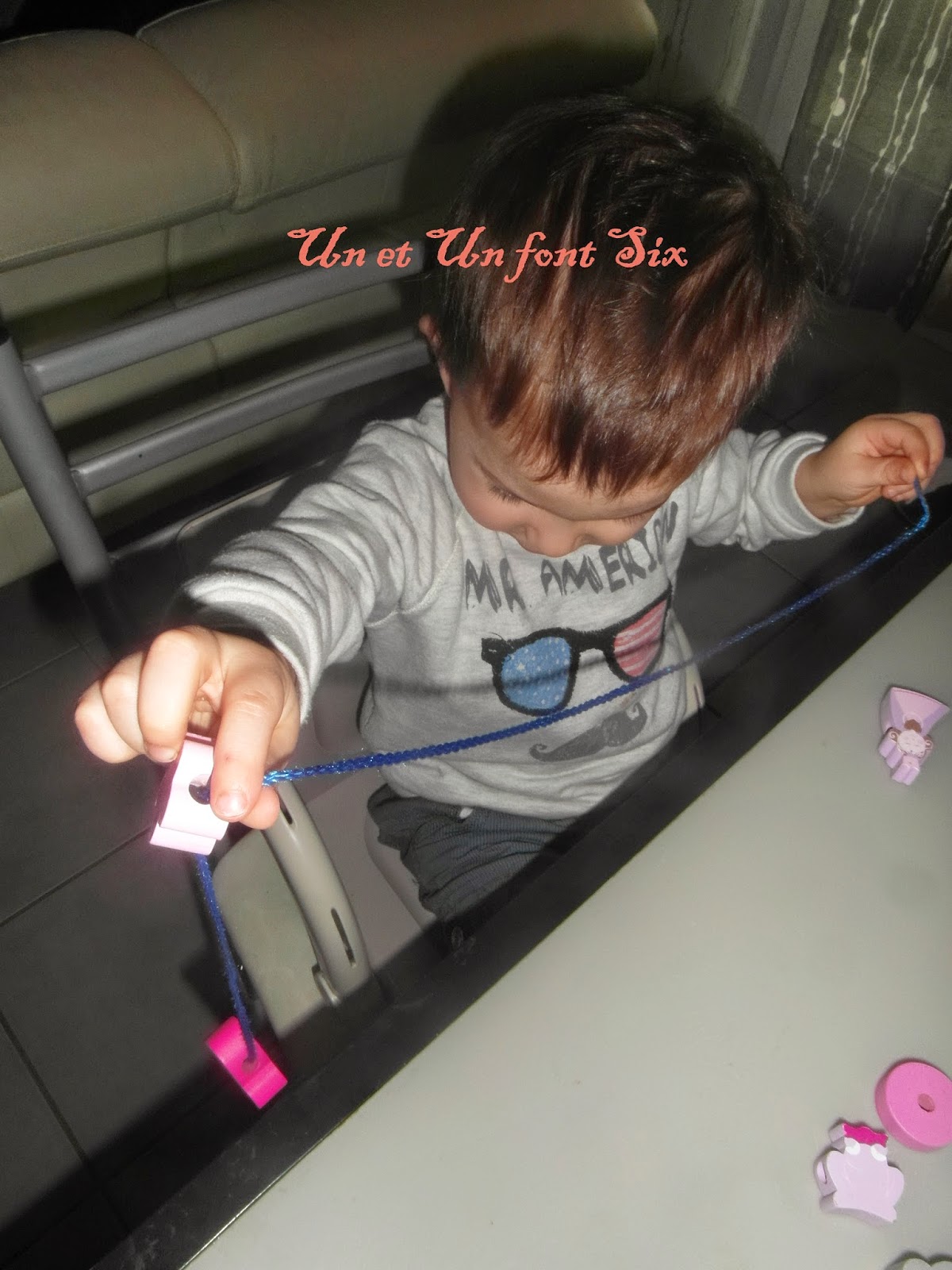 Juju enfile toujours trés bien ses grosses perles en bois de chez Oxybul. Il faut que je passe a des plus "petites" .