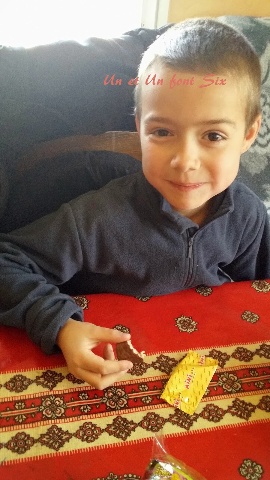 T qui mange un chocolat de Pâques chez papu , reçu ce matin .