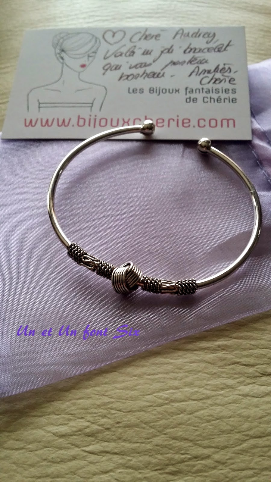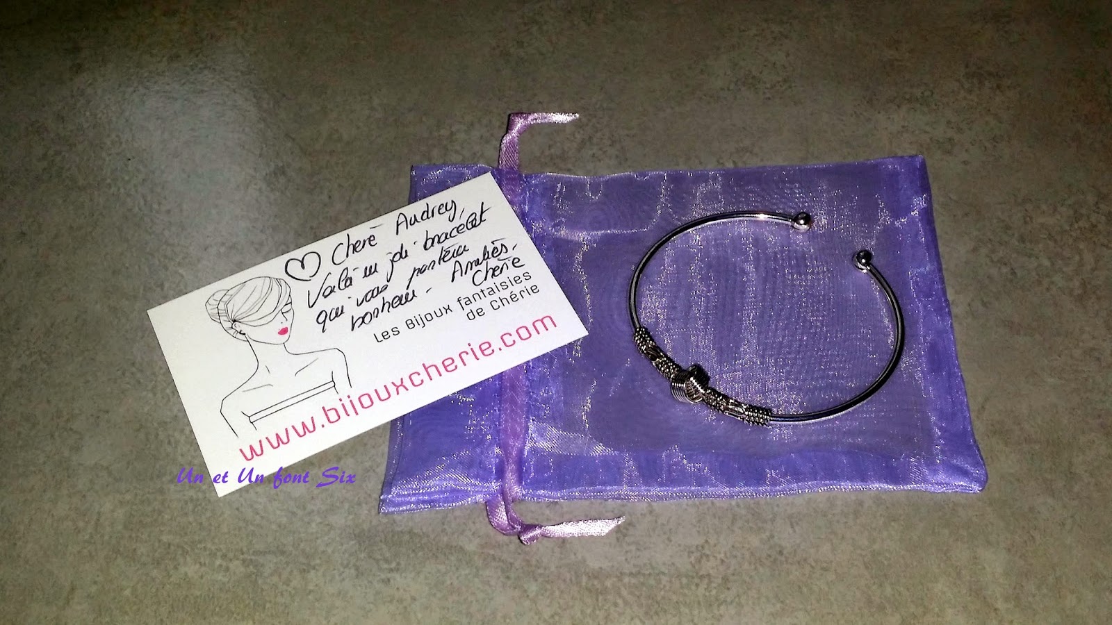 J'ai donc été en contact avec Chérie de la boutique "Bijoux Chérie",qui tient une boutique de bijoux qui nous fait voyager.En discutant avec, elle a su de suite ce qui me ferait plaisir, je suis plutôt du genre bijou discret donc elle m'a fait un joli cadeau " Un bracelet ethnique chic". Emballé dans un papier bulle et recouvert d'un petit pochon parme satiné associé à une jolie carte de visite et une spéciale dédicace. (J'adore cette intention)