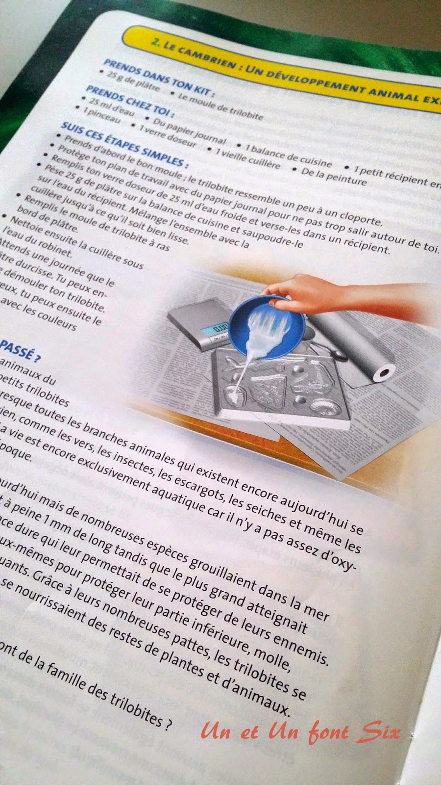 Cette première expérience consiste à faire en plâtre un cambrien pour mieux se rendre compte de leur forme ...( Photos jointes). Cette première page du livret nous renvoit dans le passé sur ce qui s'est passé? et nous fait découvrir des fossiles vivants . ( Je n'ai pas voulu prendre en photo la page entière car je préfère vous en parler par divers sources qui nous ont aidé à
