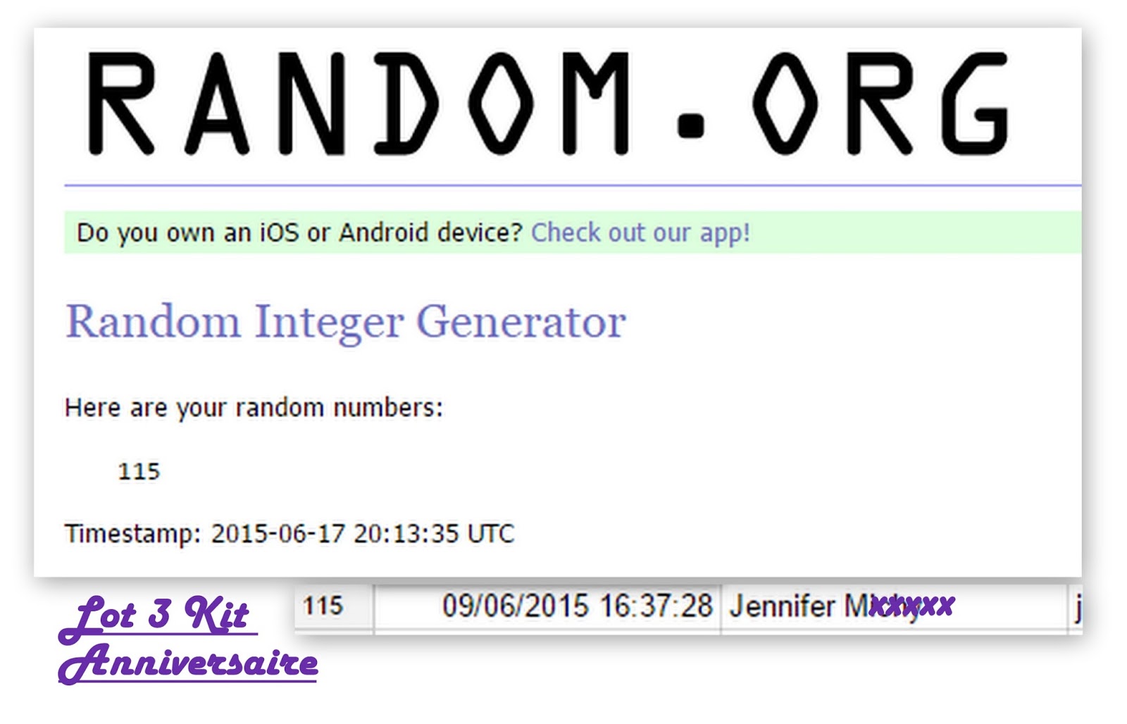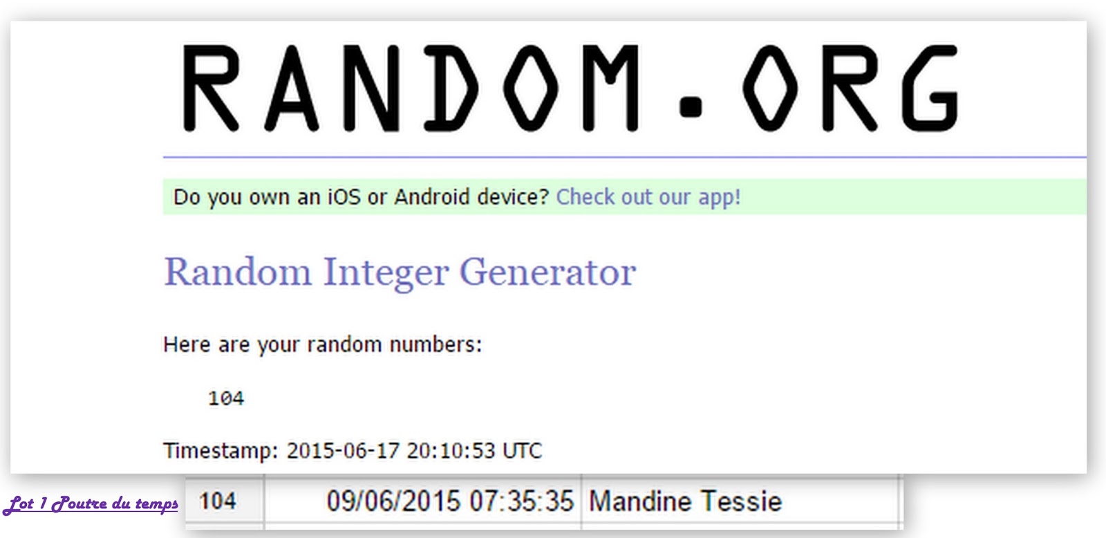 Tirage au sort random.org , Résultat 17/06/15