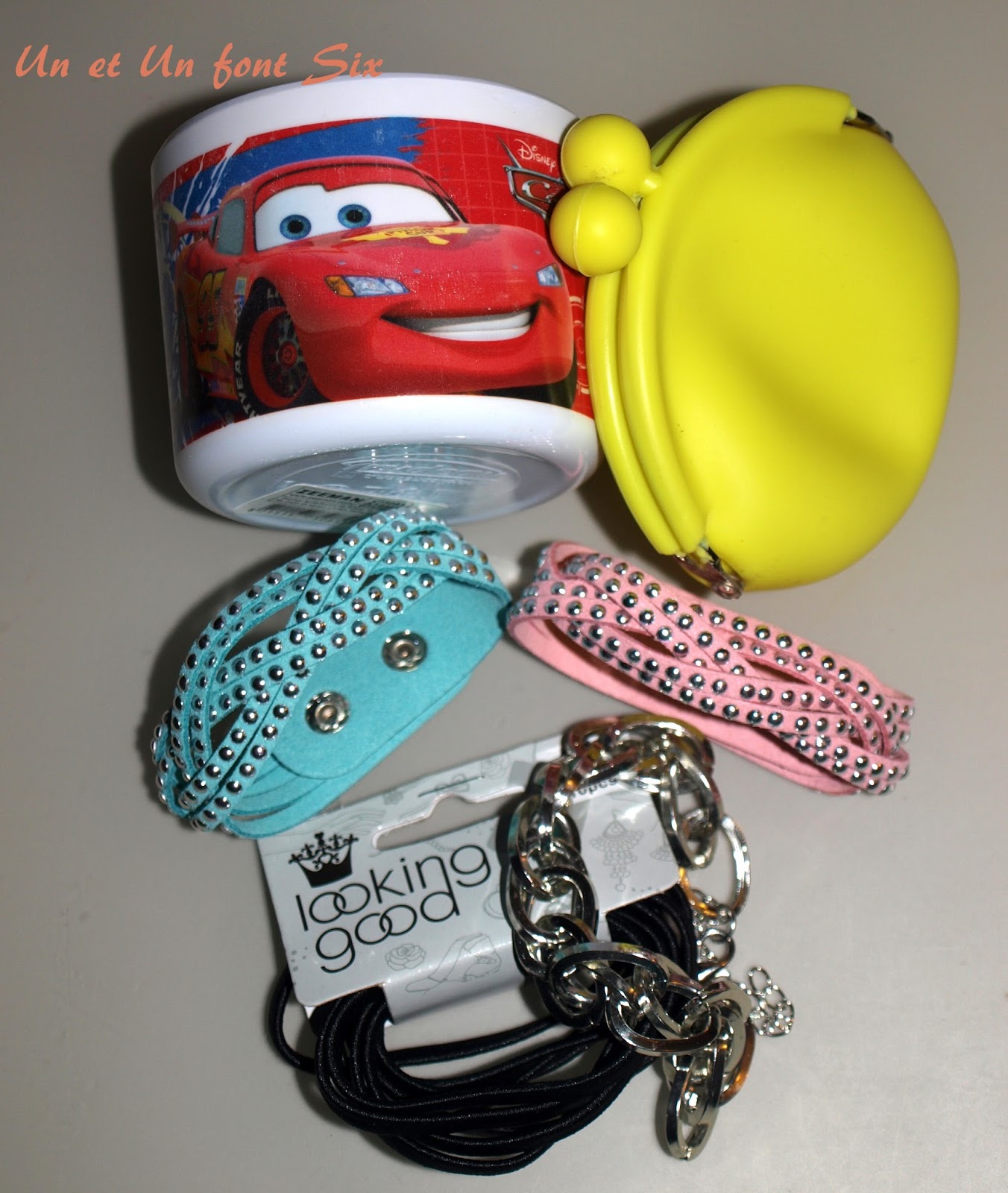 Une petite tasse Cars pour mister Jules, un porte monnaie pour la grande et des bijoux, élastiques pour maman