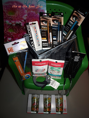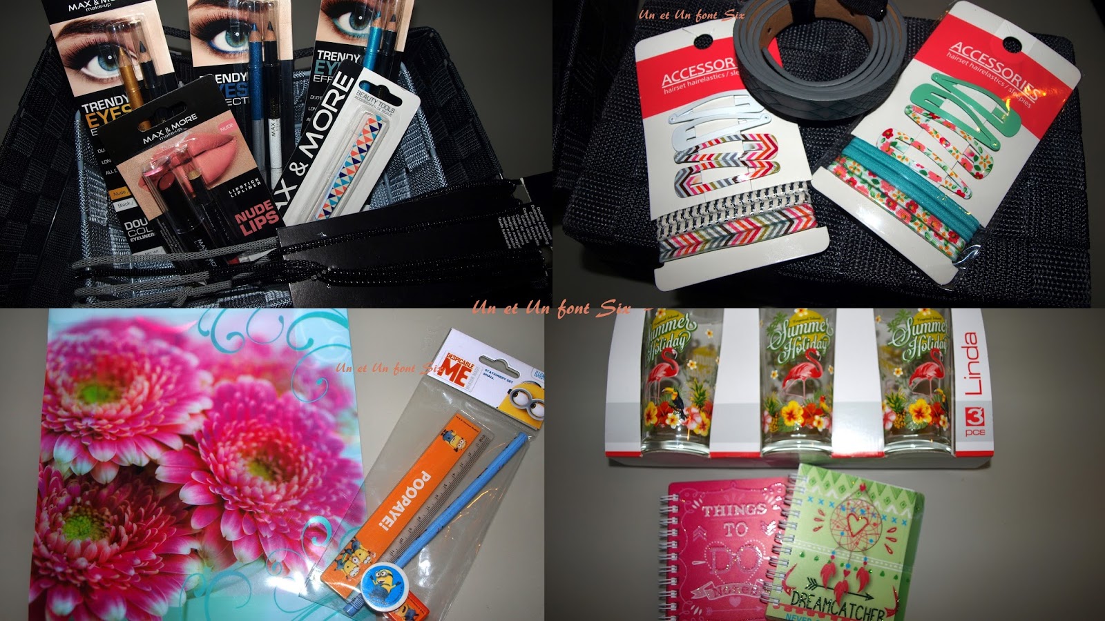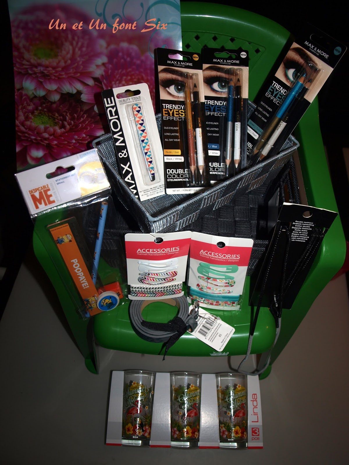 Trois petits paniers pour tout trier, du maquillage , collier, pince à épiler j'en ai déjà mais j'aimais beaucoup le graphisme! Des accessoires cheveux pour les filles, une ceinture pour byby ! Une pochette cadeau d'avance qui sera utilisé la semaine pro , un kit minions je vous dis pas pour qui ! De nouveaux verres que mon mari détestent et des carnets pour les filles qui ont voulu le même que moi.
