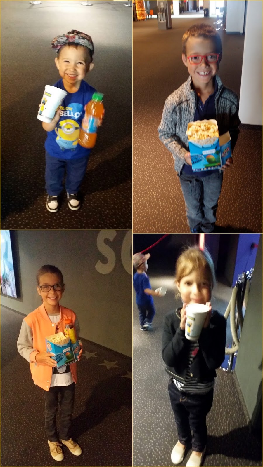Puis nous sommes entrés en salle où nous avons englouti la moitié des pop corn avant le film et juju lui se baladait ( je lui avais expliqué qu'à extinction des lumières , il fallait s'asseoir) . Puis le film a débuté , entre le film , boire et grignoter des bonbons, les 1h31 sont vite passées.