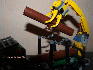 Le bûcheron se place sur le siège de contrôle et manœuvre le bras de la grue en position pour charger les troncs!