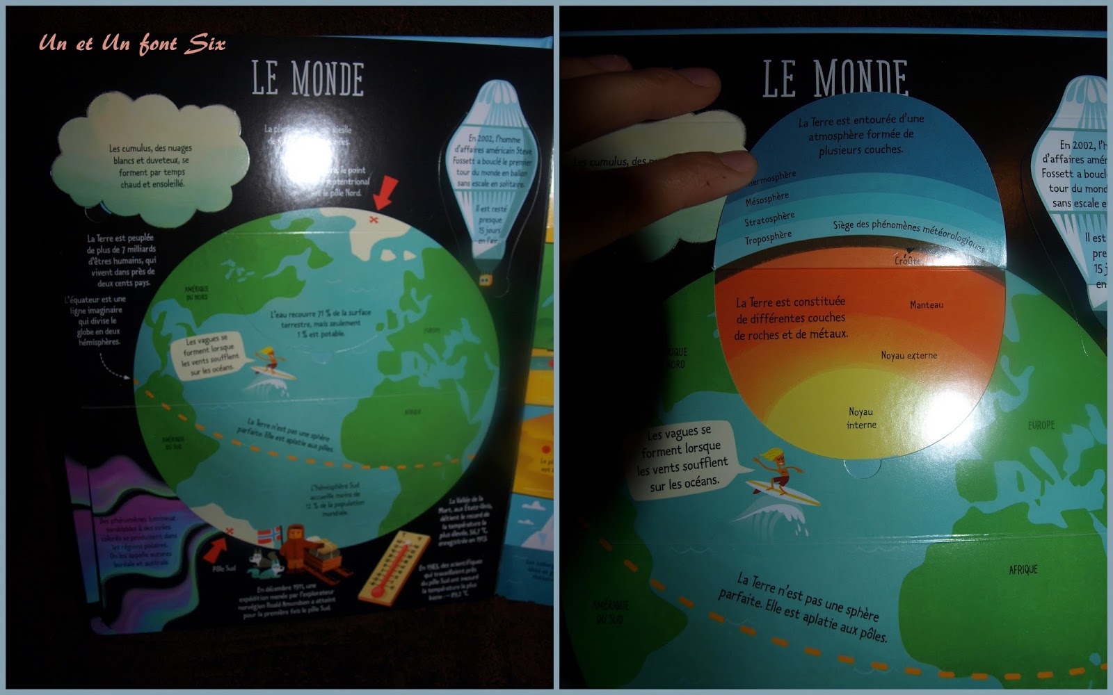 C'est parti pour découvrir le Monde , une première image avec une terre , plein d’annotations et un premier rabat nous fait découvrir la croûte terrestre , un second découvrir le monde par une numérotations de lieux qu'on va découvrir en photos.