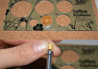 Le choix des couleurs est fait , nous pouvons enrouler avec l'outil enrouleur et mettre à bonne dimension le rond à l'aide de la réglette. Une pointe de colle au cure dent ou pinceau et c'est fini! Vous pouvez aussi donner un coup de colle au pinceau par dessus pour être sur que ça soit plus solide.