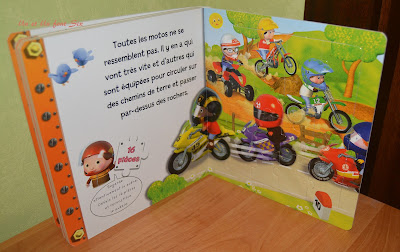 Il est cartonné, coloré, robuste . Une histoire simple et sympa sur les motos qu'il adore , il a pu découvrir une variété de motos et surtout faire des puzzles .