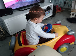 Un petite tour dans la voiure de Oui oui qu'il avait reçu à son anniversaire , il me fait trop rire il met même une clé pour qu'elle démarre...