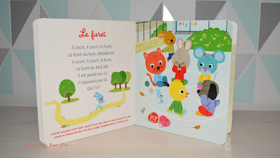 Un petit dernier des éditions Gründ , son premier livre de comptines que Petit Pois découvrira grâce à Timoté. J'aime beaucoup ces petits livres qui ont sur chaque page une petite puce sonore qui sortira un doux son , sous l'appuie du doigt de bébé . En grandissant, il pourra associer les tendres illustrations aux comptines. Dans celui ci, il découvrira Jean Petit qui danse, Dans la fôret lointaine, la Barbichette...........