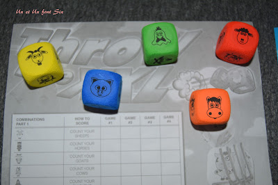 Ce petit jeu est un Yams facile mais revisité avec des animaux (poule, chèvre, mouton, vache, cheval et cochon) et des dés de couleurs. ( jaune, orange, rouge, bleu et vert).