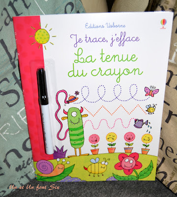 On commence par un livre d'activité graphique effaçable de la collection " Je trace, j'efface" des éditions Usborne. Mon 4 ans l'utilise régulièrement car d'un coup de mouchoir , on peut recommencé même si on n'a un peu raté ! Livré avec son crayon effaçable qu'on ne peut perdre grâce à son emplacement sur le devant!