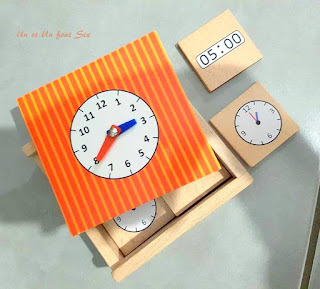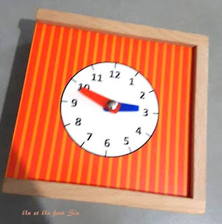 Pour compléter, les informations nous avons un petit jeu en bois avec une horloge sur le dessus et des petites fiches avec un coté version numérique et sur l'autre face pour la correction une face hotloge analogique.