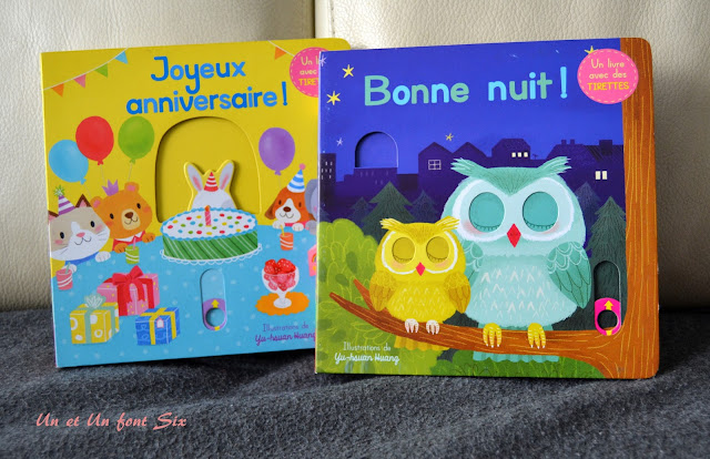 Pour parler de ces 2 livres , ils sont assez épais donc pas de risque que des petites mains les déchirent, ils sont maniables, colorés et chaque page contient une tirette ou une roulette à faire découvrir à l'enfant.