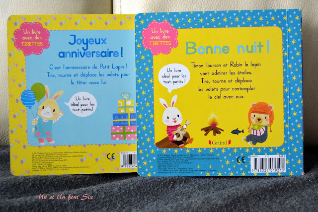 Pour parler de ces 2 livres , ils sont assez épais donc pas de risque que des petites mains les déchirent, ils sont maniables, colorés et chaque page contient une tirette ou une roulette à faire découvrir à l'enfant.