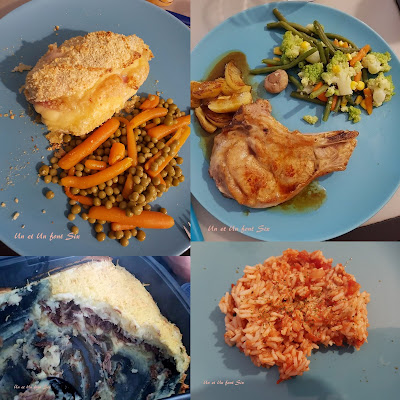 Cordon bleu maison, Côtes de porc ( qui était du veau) aux pommes ( sauce miel citron), Hachis parmentier de canard, Riz thon tomates
