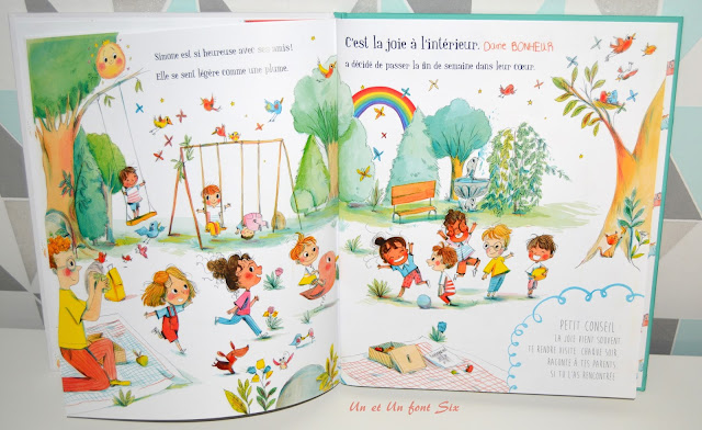 Les émotions sont représentés par des petits bonhommes tout mignon de couleurs différentes . Tous au long de l'histoire Simone l’héroïne , nous fait découvrir toutes les émotions que nous pouvons ressentir tout au long de notre vie , ici sur une semaine ! Grâce a des conseils , Simone réussit à gérer ses émotions ! Des conseils que nous pouvons nous même mettre en pratique comme penser à quelque chose de drôle quand on a peur .....