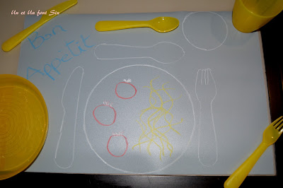 Notre ardoise géante grise a été livré avec une éponge et 4 "ButterStix" Blanches , nous possédions déjà un set de table que j'avais acheté à Jules plus jeune donc un max de réalisations avec les"butterstix" blanches et colorés ici.