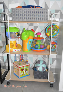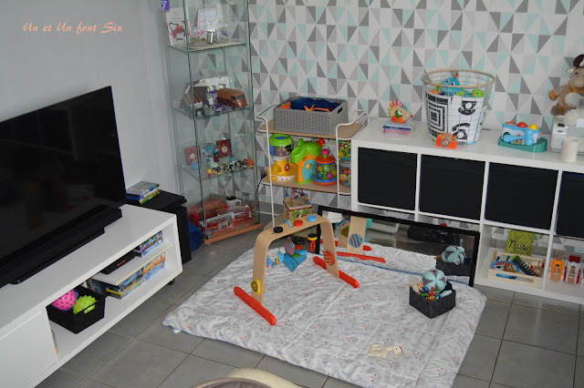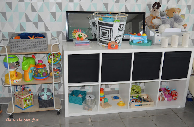 Nous avons racheté un grand meuble qui leur permettent d'avoir accès facile à leurs objets. Et au dessus des cassiers de jeux, des livres à lire avec une grande personne, d'activités ...