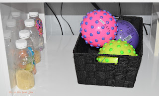 Une boite ballons sensoriels ( il manque un orange genre ballon de volley ) et bouteilles sensorielles pareil la bouteille rouge avait disparu!