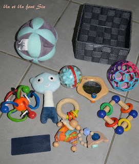 Il adore ses disques entrelacés Bisoserie qui ne figurent pas sur la photo car on les trimbale partout ainsi qu'un hochet Deglingos