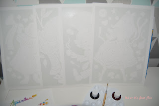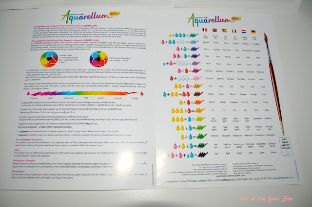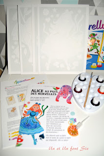 Dans le coffret il y a donc 4 planches prêt à peindre sur le thème d'Alice au pays des merveilles. Une palette avec des aquarelles , un pinceau, une pipette pour doser les gouttes afin d'obtenir les nuances souhaitées, un guide afin de réaliser les nuances.