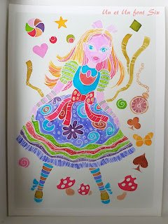 Dans le coffret il y a donc 4 planches prêt à peindre sur le thème d'Alice au pays des merveilles. Une palette avec des aquarelles , un pinceau, une pipette pour doser les gouttes afin d'obtenir les nuances souhaitées, un guide afin de réaliser les nuances.