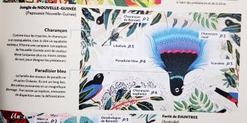 A la fin du livre, il y a la solution à chaque image avec des explications sur chacun des animaux de la page comme pour le Paradisier Bleu qui ne vit qu'en Océanie . Ils ont un long bec, des pattes puissantes et un magnifique plumage. Il en existe 40 espèces , menacées de disparition avec la déforestation .