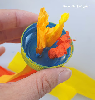 Pendant le sechage , découper du papier crépon sur toute la longueur de plusieurs couleurs de facon à former une flamme coloré. Ici nous avons choisi 3 couleurs .